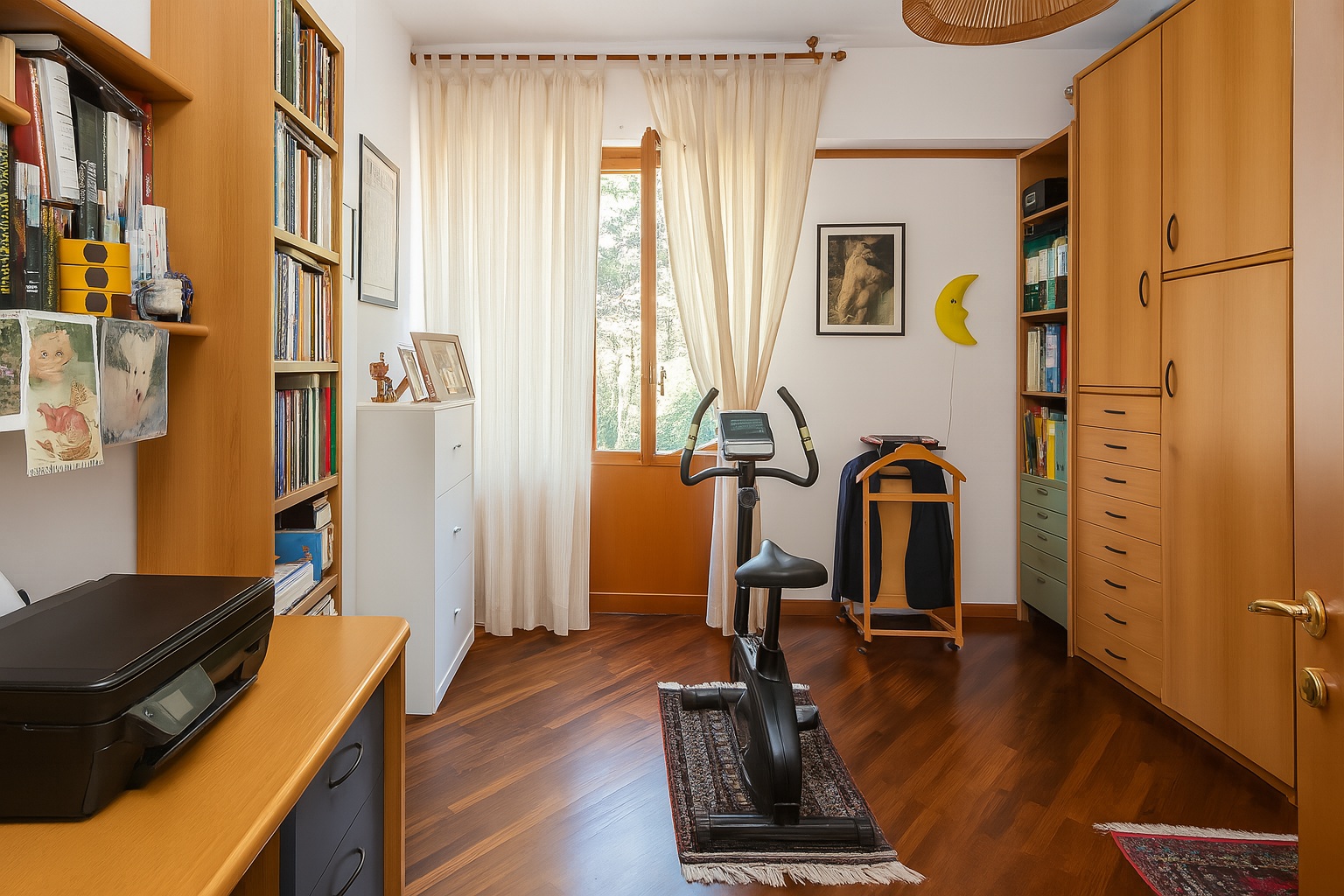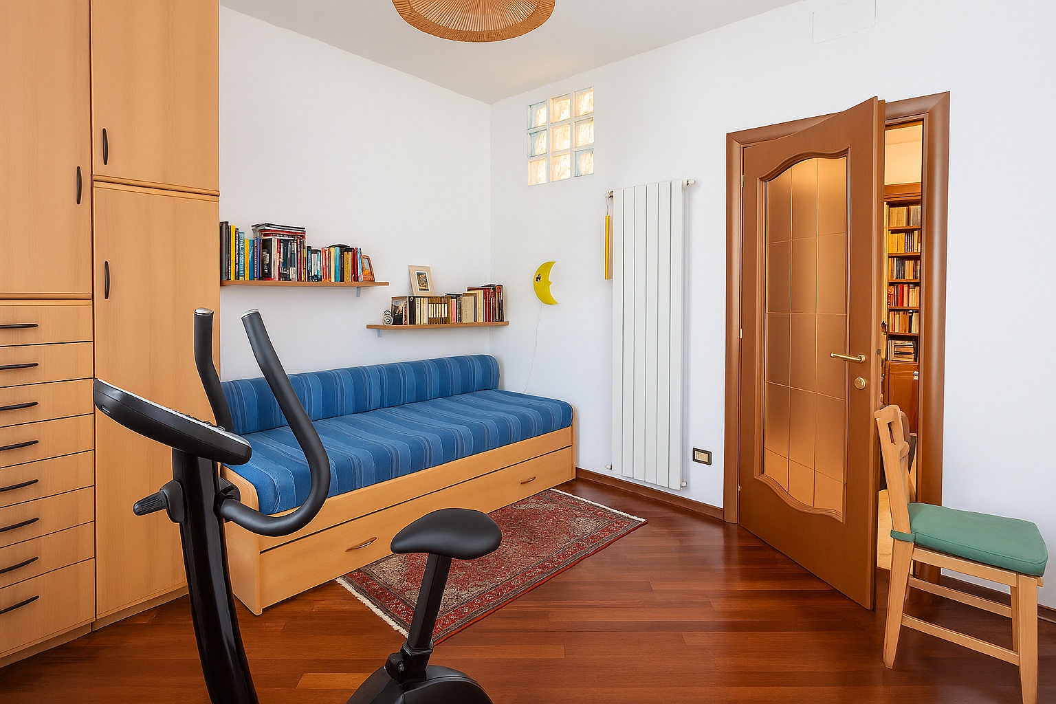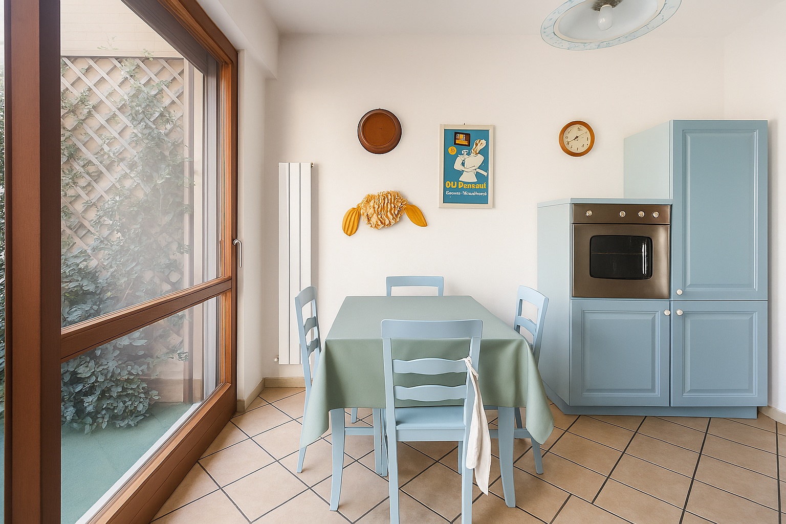 L’appartamento è termoautonomo, con infissi originali in legno che conservano il fascino dell’epoca. La ristrutturazione interna risale al 2006, mantenendo intatto il carattere della casa pur offrendo spazi moderni e vivibili. A completare la proprietà, un comodo garage di 27 m² situato al piano seminterrato della stessa palazzina.