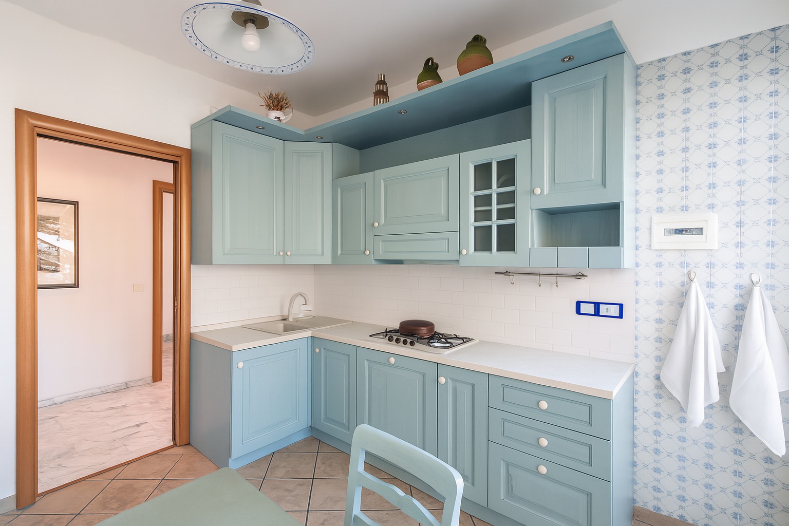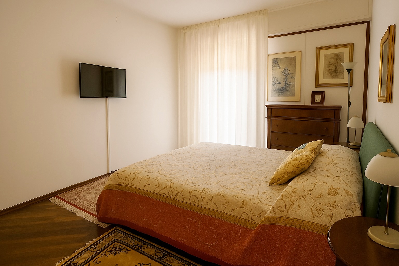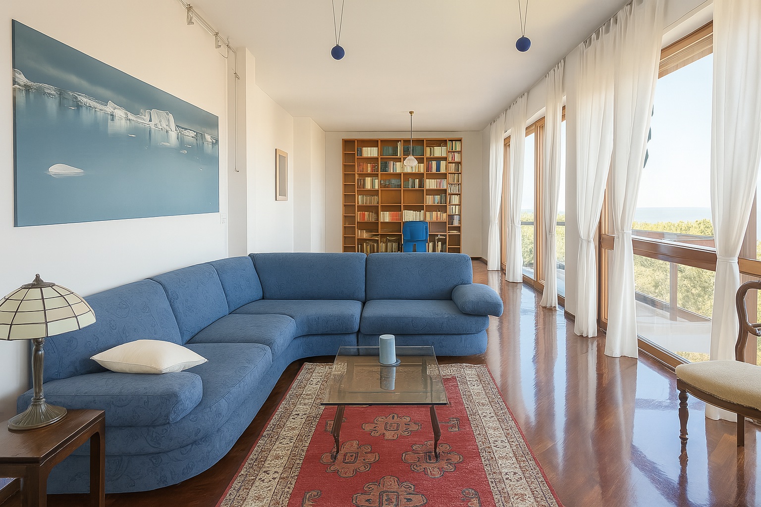 L’abitazione si sviluppa al terzo e penultimo piano, con una superficie generosa di 131 m² e una tripla esposizione che regala luce naturale durante tutto l’arco della giornata. La vista è davvero suggestiva: si può ammirare il mare e le montagne, incorniciati da ampie finestre panoramiche che trasformano il soggiorno in un vero e proprio quadro vivente.