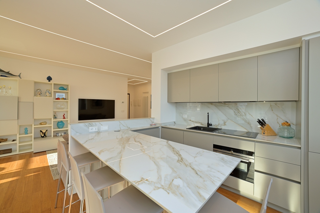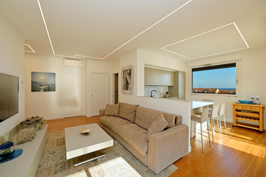 – luminosa zona living con cucina a penisola e splendida vista mare,
