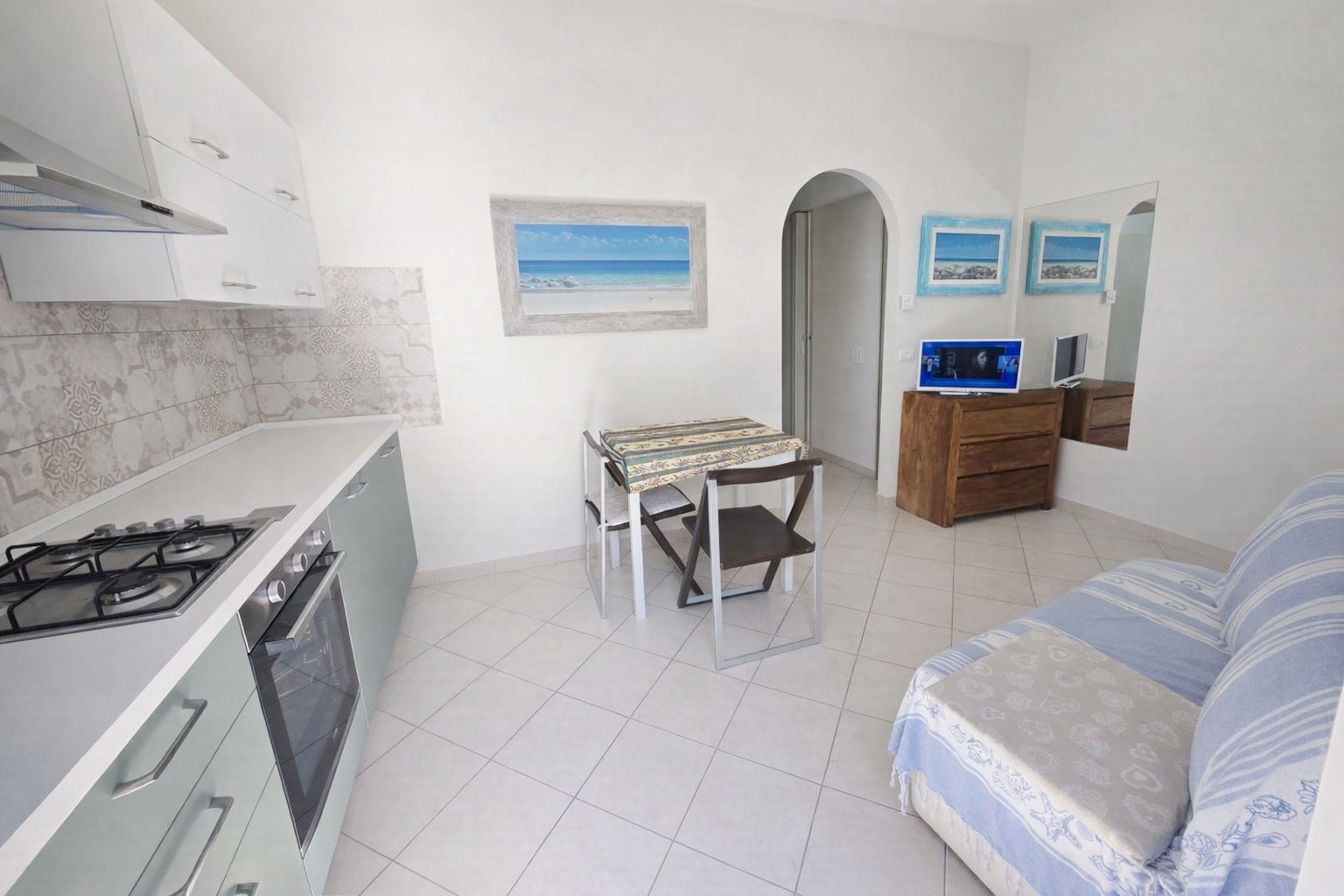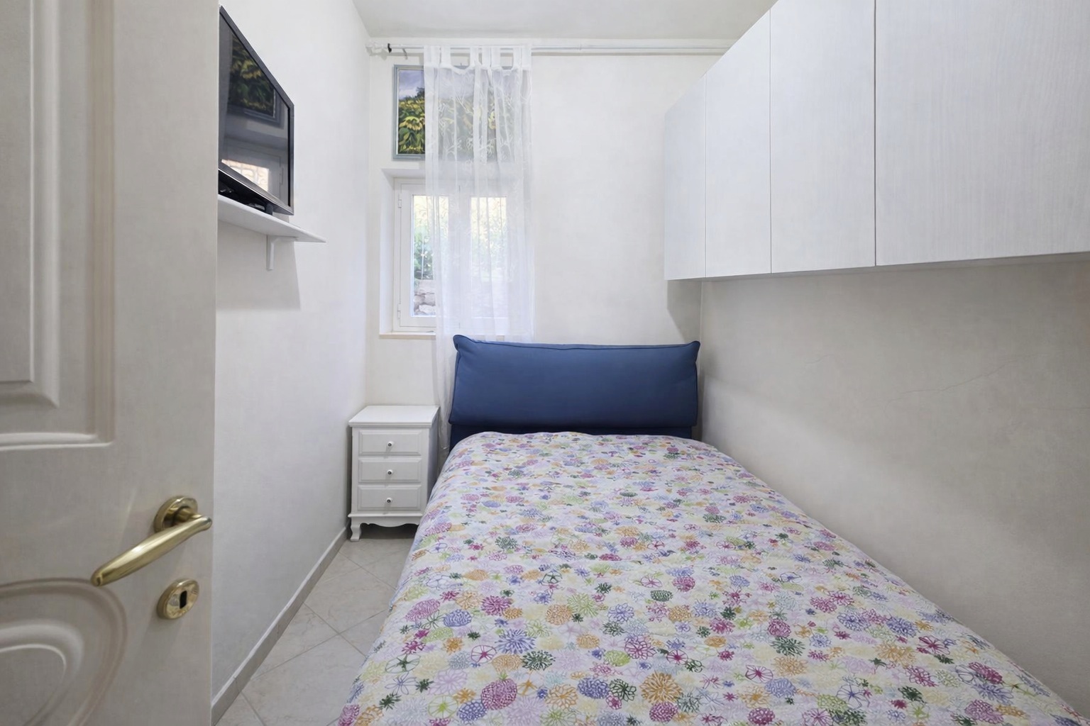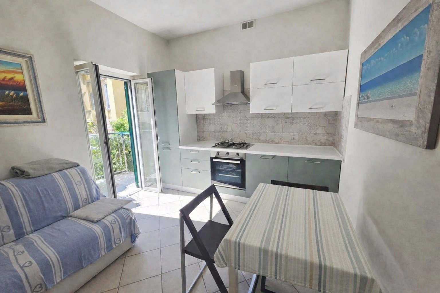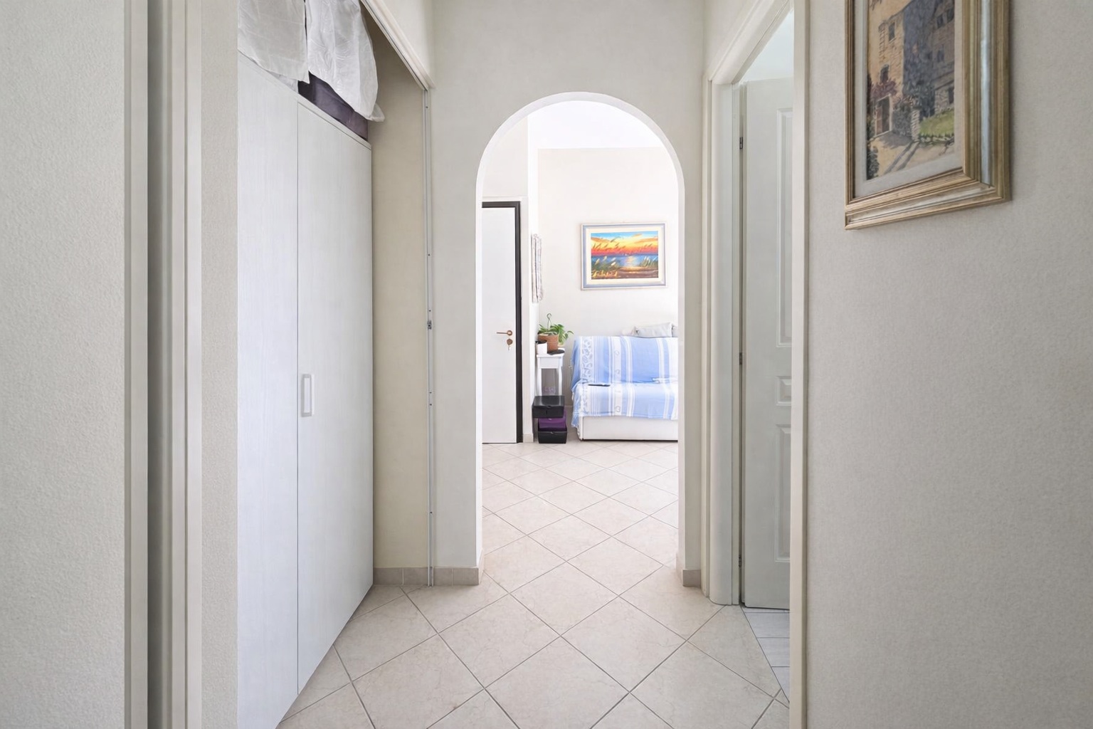 L’ingresso si apre su un soggiorno luminoso con cucina a vista e accesso al balcone; la zona notte comprende due camerette, entrambe danno sul terrazzo, e un bagno finestrato con doccia, ripostiglio.
