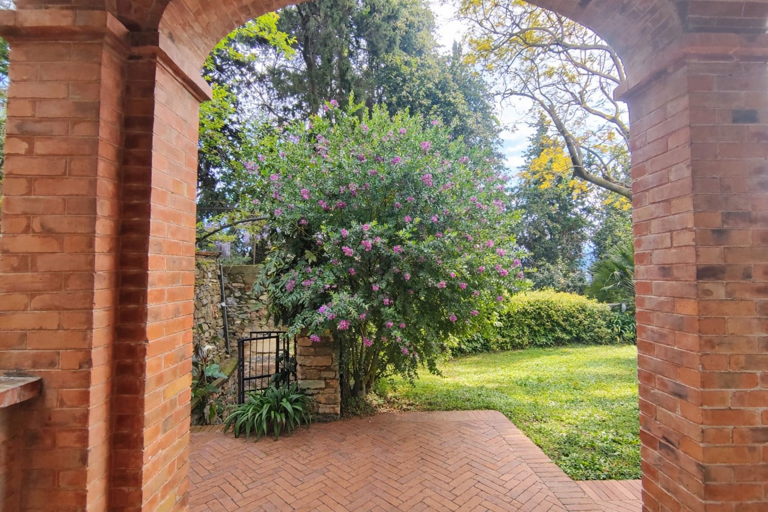 All’esterno, la villa è circondata da un giardino curato, dove fiori colorati, erbe aromatiche e alberi da frutta creano un’atmosfera piacevole e rilassante. Alcuni angoli verdi sono suddivisi in fasce di prato, mentre glicine e ulivi aggiungono un tocco mediterraneo all’ambiente.